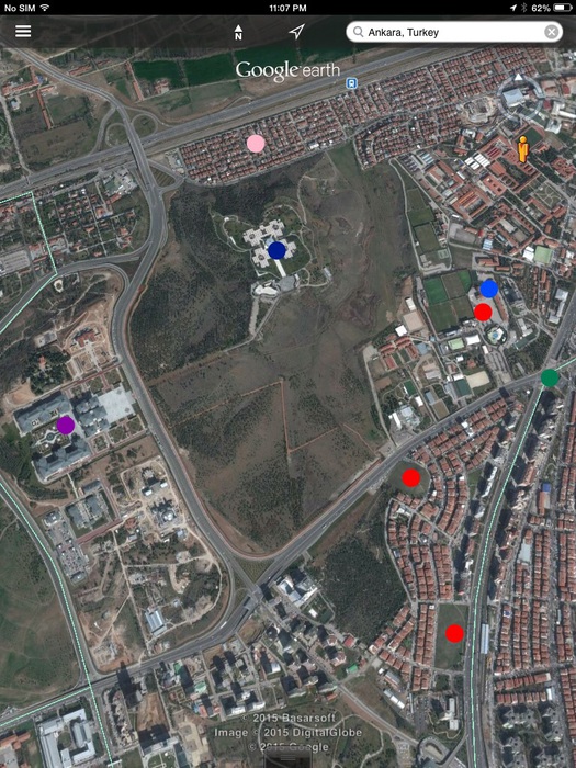 Bu iki tümülüs haricinde, Beştepeler olarak adlandırılan bu bölgede üç tane daha tümülüs bulunuyordu. Bu üç tümülüsün yerini aşağıdaki fotoğrafta kırmızı nokta ile gösterdim. Bunlardan en üstte olanı, ne yazık ki, artık yok. Gençlerbirliği'nin tesisleri nedeni ile bu tümülüs kazıldı. Kazılmadan önce kurtarma kazıları yapılmış ama ne kadarı kurtarıldı, neler bulundu bilmiyorum.